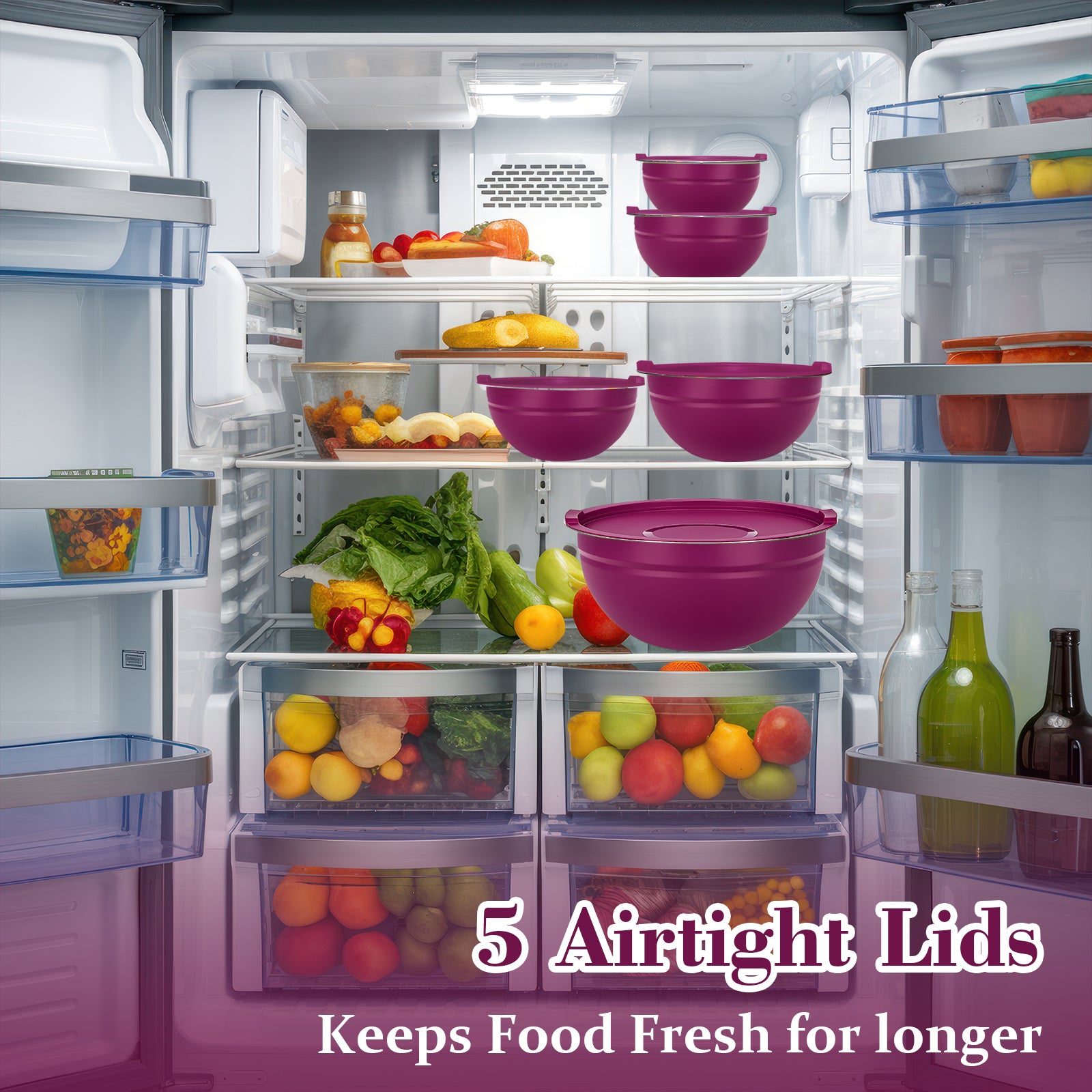 Laoyebaoho Mixing Bowls with Lids, 5 Pcs Stainless Steel Nesting Mixing Bowls for Kitchen,Great for Cooking, Purple