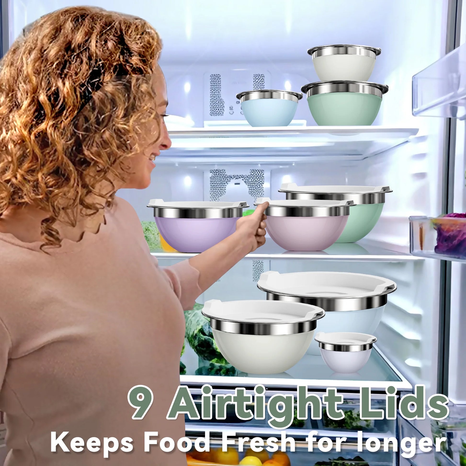 Laoyebaoho Stainless Steel Mixing Bowls with Lids, 9 Pcs Metal Nesting Mixing Bowls for Kitchen,Great for Cooking, Baking, Serving